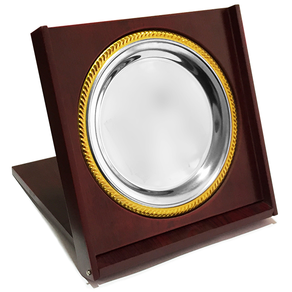 Galvano de madera con soporte para bandeja circular metálica plateada con contorno dorado.